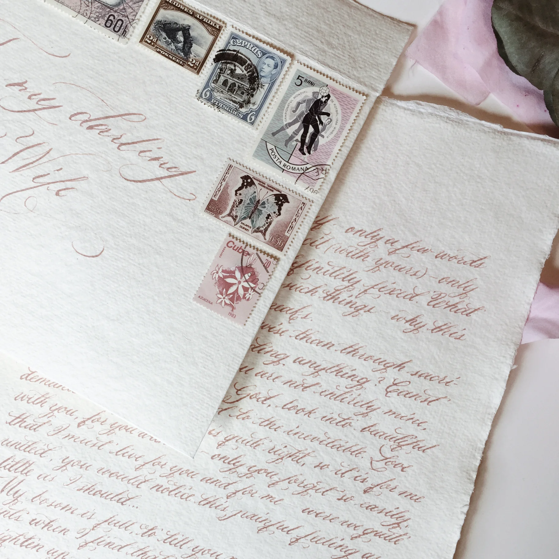 Handwritten love letter with vintage stamped envelope / handmade paper